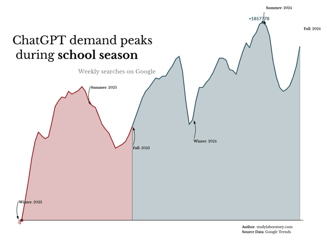 A concerning spike in Google searches for ‘ChatGPT’ coinciding with the start of each school term.